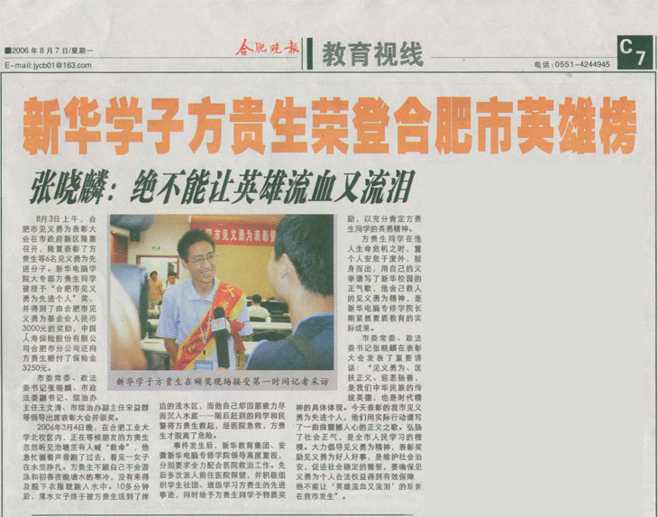 8月7日,《合肥晚報》報道:“新華學子方貴生榮登合肥市英雄榜”, 敬請關注