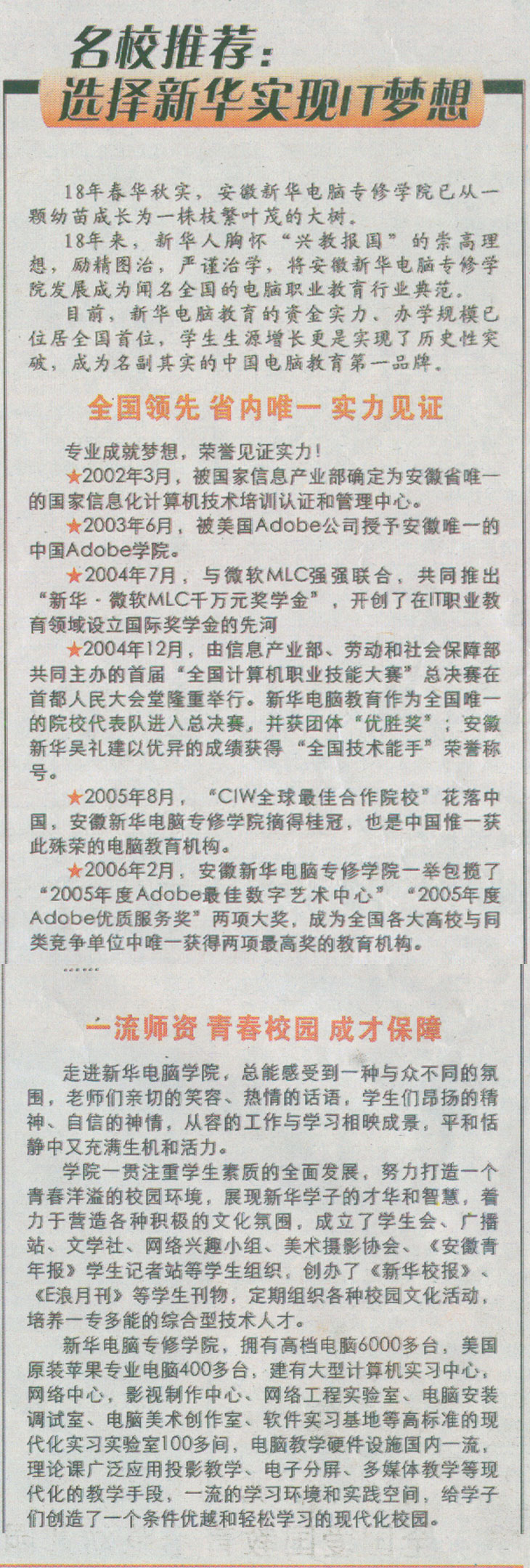 8月7日,《合肥晚報》報道:“選擇新華實現(xiàn)IT夢想”, 敬請關(guān)注!