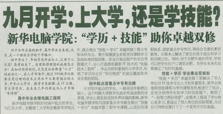 當前位置:首頁 > 新聞中心 > 青春新華 > 《合肥晚報》報道:九月開學:上大學,還是學技能?