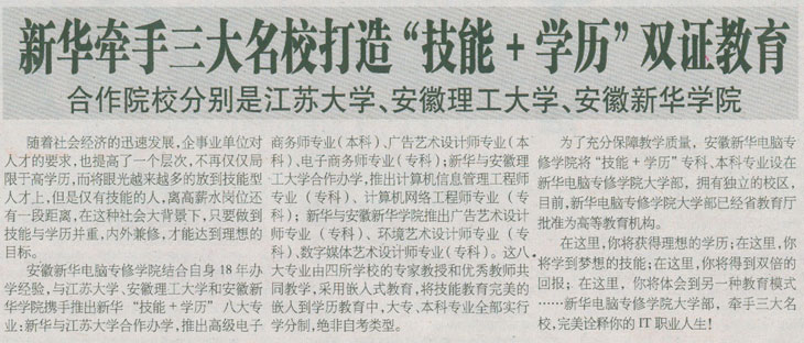 當前位置:首頁 > 新聞中心 > 青春新華 > 《合肥晚報》報道:新華牽手三大名校打造“技能+學(xué)歷”雙證教育