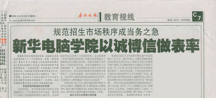 見到報道后,新華電腦專修學院院長沙旭遺憾地表示:“民辦教育的發展不容易,能走到今天得益于國家教育政策的正確引導,是各級政府和社會各界大力支持的結果,是全體教育工作者辛勤勞動的結果!而部分培訓機構為了短期利益而不顧長遠發展,在教學資源不足的情況下無原則盲目擴招、在培訓規模和實力方面做虛假廣告、通過高額回扣拉搶學生的手段還時有發生,給我省民辦教育機構的整體形象帶來了一定的負面影響,及時規范勢成當務之急。我們呼吁民辦教育機構通過積極良性的競爭,共同營造‘合肥科教城’的良好社會氛圍!”