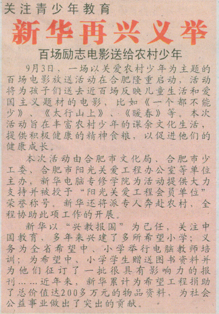 9月11日,《合肥晚報》C7版報道:“新華再興義舉”, 敬請關注!