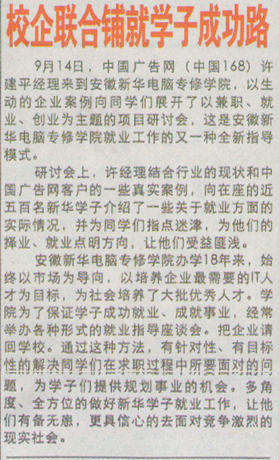 9月20日,《合肥晚報》C7版報道:“校企聯合鋪就學子成功路”, 敬請關注!