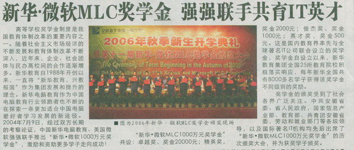 10月2日,《合肥晚報(bào)》C7版報(bào)道:“新華•微軟MLC獎(jiǎng)學(xué)金 強(qiáng)強(qiáng)聯(lián)手共育IT英才”, 敬請(qǐng)關(guān)注!