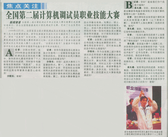2004年12月1日,全國首屆全國計算機調試員應用技能大賽決賽在首都北京人民大會堂圓滿結束。新華電腦教育代表隊代表安徽獲得了個人組亞軍,團體“優勝獎”的好成績,為安徽爭得至高榮譽。在第二屆全國計算機調試員應用技能大賽即將舉行之際,記者分別采訪了首屆全國計算機調試員應用技能大賽個人組亞軍、“全國技術能手”安徽新華電腦專修學院吳禮建老師和安徽新華電腦專修學院沙旭院長,以下采訪記錄: