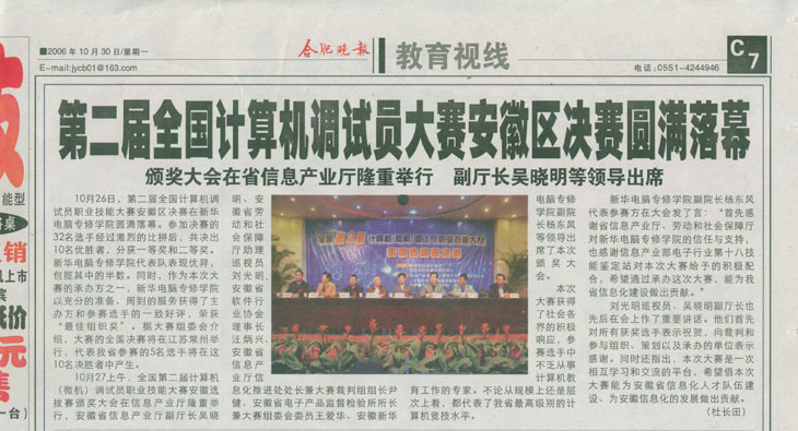 10月31日,《合肥晚報》C7版報道:“全國第二屆計算機調試員大賽安徽區決賽取得圓滿成功”, 敬請關注!
