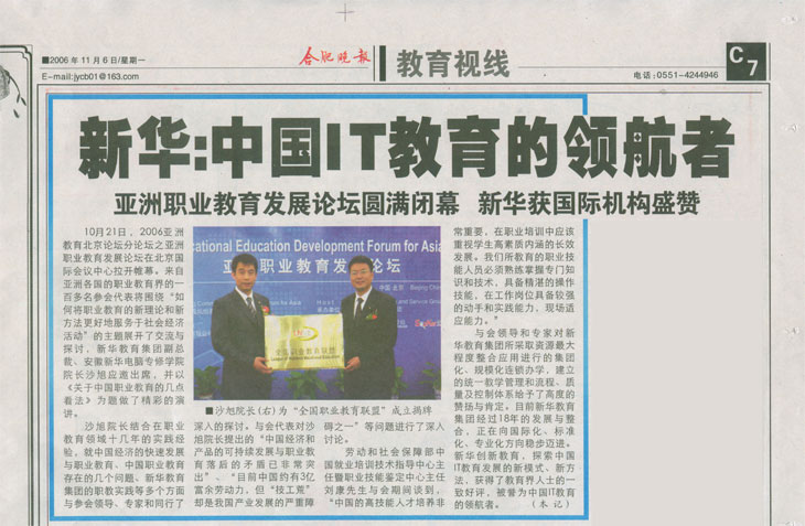 11月6日,《合肥晚報》C7版報道:“新華:中國IT教育的領(lǐng)航者”, 敬請關(guān)注!