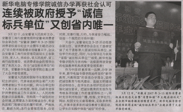3月13日,《安徽商報(bào)》報(bào)道:“新華電腦專修學(xué)院誠(chéng)信辦學(xué)再獲社會(huì)認(rèn)可—連續(xù)被政府授予‘誠(chéng)信標(biāo)兵單位’又創(chuàng)省內(nèi)唯一”,敬請(qǐng)關(guān)注!