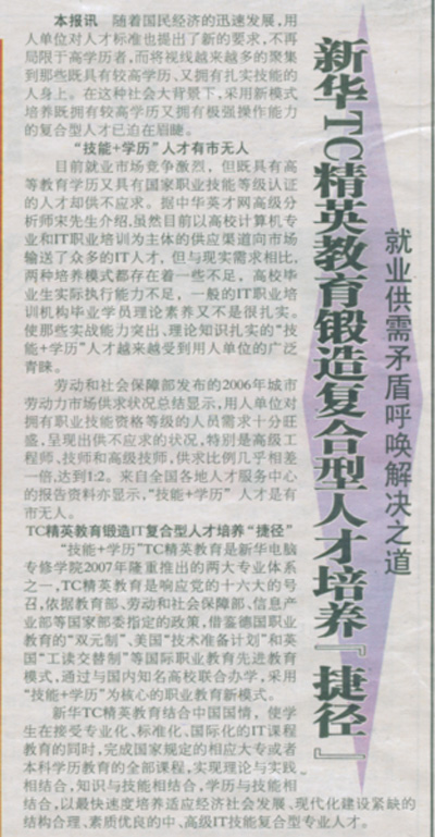 4月2日,《合肥晚報》報道:“就業供需矛盾呼喚解決之道——新華TC精英教育鍛造復合型人才培養‘捷徑’”,敬請關注!