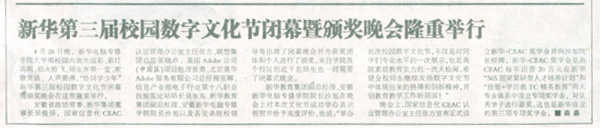 4月30日,《安徽市場報》報道:“新華第三屆校園數(shù)字文化節(jié)閉幕暨頒獎晚會隆重舉行”,敬請關(guān)注!