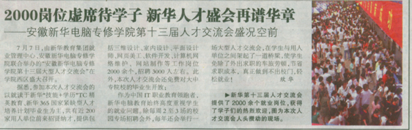 7月10日,《安徽市場(chǎng)報(bào)》報(bào)道:“2000崗位虛待學(xué)子 新華人才盛會(huì)譜華章——安徽新華電腦專修學(xué)院第十三屆人才交流會(huì)盛況空前 ”,敬請(qǐng)關(guān)注!