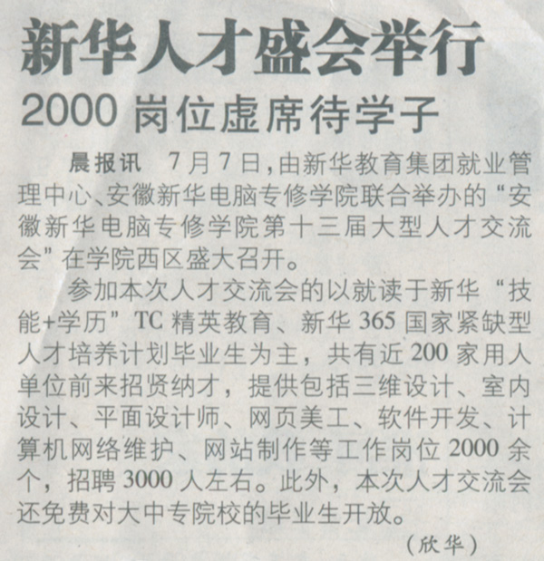 7月11日,《江淮晨報》報道:“新華人才盛會舉行——2000崗位虛席待學子”,敬請關注!