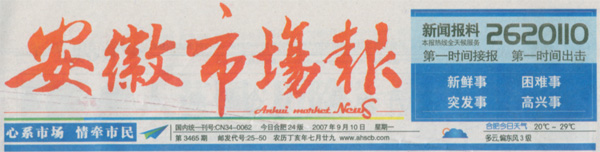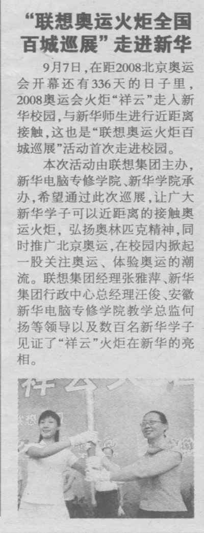 9月10日,《安徽市場(chǎng)報(bào)》報(bào)道:“‘聯(lián)想奧運(yùn)火炬全國(guó)百城巡展走進(jìn)新華’”,敬請(qǐng)關(guān)注!