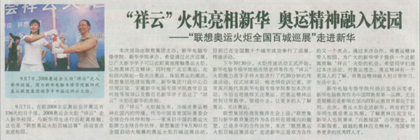 9月10日,《合肥晚報(bào)》報(bào)道:“‘祥云’火炬亮相新華 奧運(yùn)精神融入校園——‘聯(lián)想奧運(yùn)火炬全國(guó)百城巡展’走進(jìn)新華”,敬請(qǐng)關(guān)注!