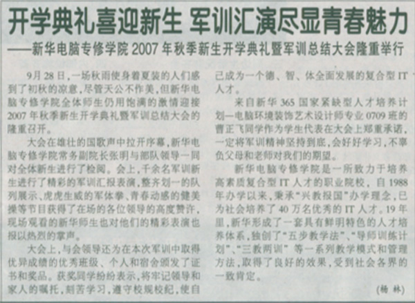 10月9日,《安徽商報》報道:“開學典禮喜迎新生 軍訓匯演盡顯青春魅力——新華電腦專修學院207年秋季新生開學典禮暨軍訓總結大會隆重舉行”,敬請關注!