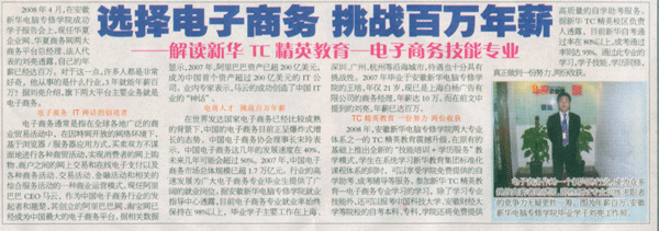 當前位置:首頁 > 新聞中心 > 青春新華 > 《合肥晚報》報道:選擇電子商務 挑戰(zhàn)百萬年薪