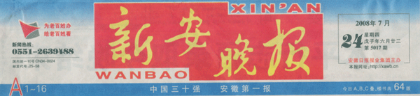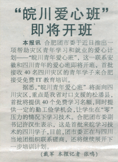《新安晚報》報頭 《新安晚報》報道新聞頁面截圖安徽新華電腦專修學院與共青團合肥市委員會啟動“新華·皖川青年愛心班”