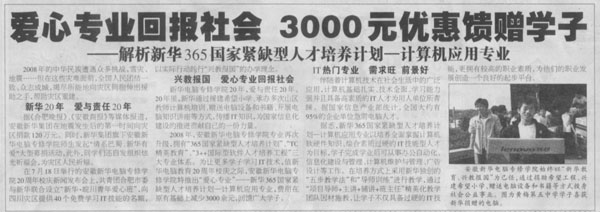 8月4日,《合肥晚報》報道:“愛心專業(yè)回報社會 3000元優(yōu)惠饋贈學(xué)子——解析新華365國家緊缺型人才培養(yǎng)計劃—計算機應(yīng)用專業(yè)”,敬請關(guān)注!
