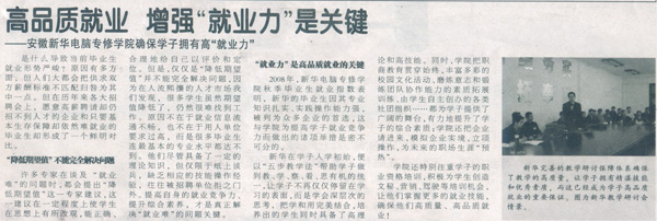 | 9月11日,《安徽商報》報道:“高品質(zhì)就業(yè) 增強‘就業(yè)力’是關(guān)鍵——安徽新華電腦專修學(xué)院確保學(xué)子擁有高‘就業(yè)力’”,敬請關(guān)注! |
