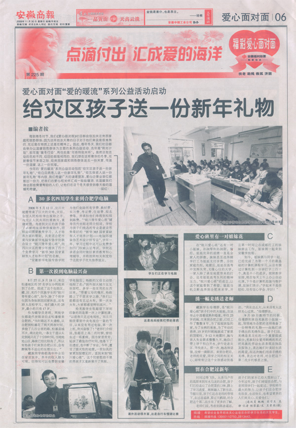 | 12月1日,《安徽商報(bào)》報(bào)道:“愛(ài)心面對(duì)面‘愛(ài)的暖流’系列公益活動(dòng)啟動(dòng)——給災(zāi)區(qū)孩子送一份新年禮物”,敬請(qǐng)關(guān)注! |