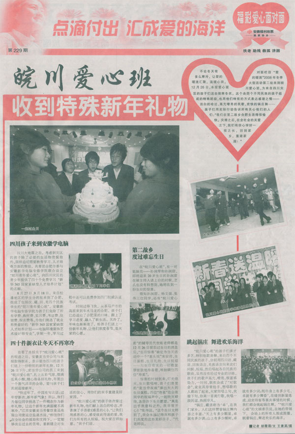 當前位置:首頁 > 新聞中心 > 青春新華 > 《安徽商報》報道:新華皖川愛心班 收到特殊新年禮物