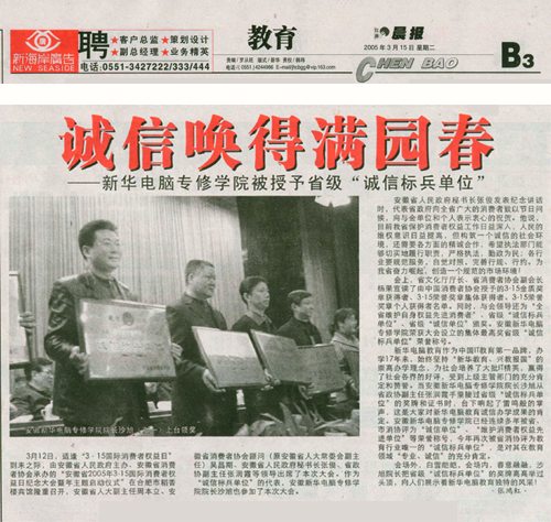 3月15日,《江淮晨報(bào)》教育版(B3)報(bào)道“誠(chéng)信喚得滿園春——新華電腦專修學(xué)院被授予省級(jí)‘誠(chéng)信標(biāo)兵單位’的消息,并做了詳細(xì)報(bào)道,敬請(qǐng)關(guān)注!
