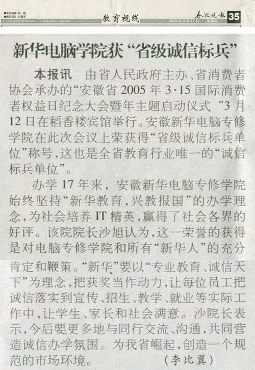3月17日,《合肥晚報》教育教育視線專版(35)報道“新華電腦學(xué)院獲省級‘誠信標(biāo)兵單位’的消息,并做了詳細報道,敬請關(guān)注!