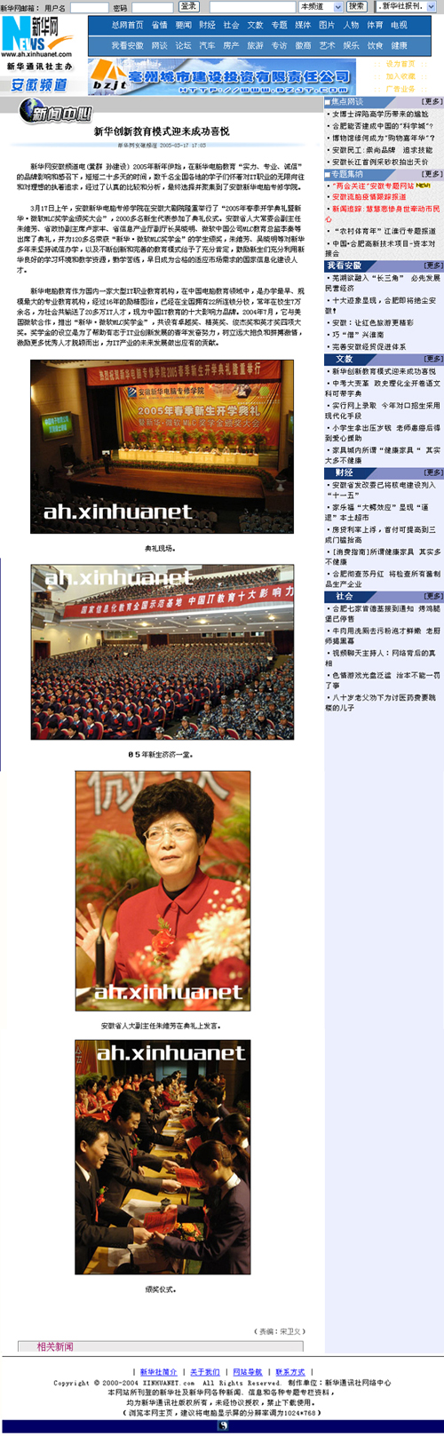 2005年新年伊始,在新華電腦教育“實力、專業、誠信”的品牌影響和感召下,短短二十多天的時間,數千名全國各地的學子們懷著對IT職業的無限向往和對理想的執著追求,經過了認真的比較和分析,最終選擇并聚集到了安徽新華電腦專修學院。
