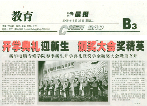 3月21日,《江淮晨報》教育專版(B3)報道新華“開學典禮迎新生 頒獎大會獎精英——新華電腦專修學院春季新生開學典禮暨獎學金頒獎大會隆重召開”的消息,并做了詳細報道,敬請關注!