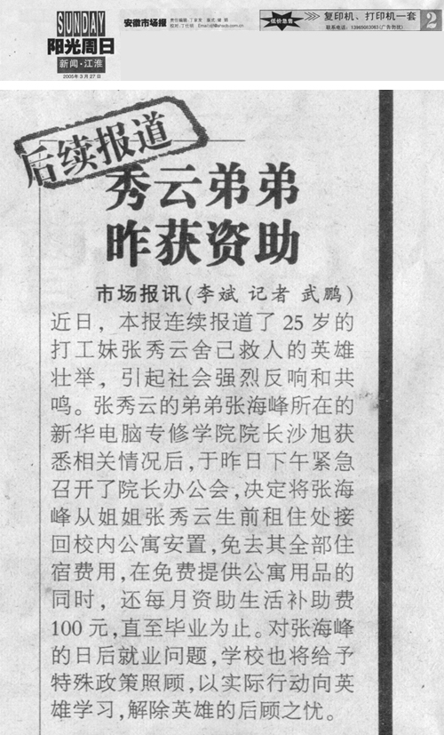2005年3月27日,《安徽市場報》報道“秀云弟弟昨獲資助”的消息并做了詳細報道,敬請關注!