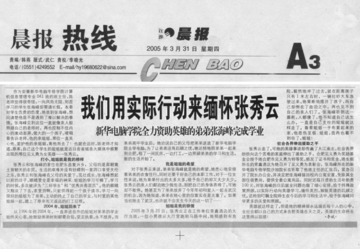 《江淮晨報(bào)》報(bào)道“新華電腦學(xué)院全力資助英雄的弟弟張海峰完成學(xué)業(yè)”新聞頁面截圖