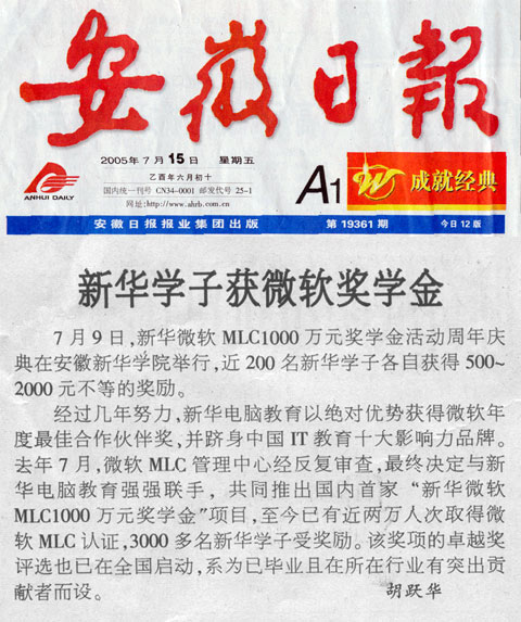 7月15日,《安徽日報》江淮要聞版報道“新華學子獲微軟獎學金獎”,并做了詳細介紹,敬請關注!