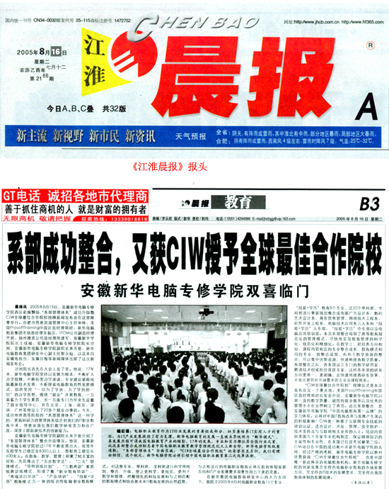8月16日,《江淮晨報》報道了“系部成功整合,又獲CIW授予全球最佳合作院校——安徽新華電腦專修學院雙喜臨門”的新聞,并做了詳細報道,敬請關注!