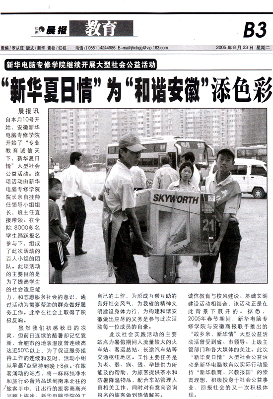 8月23日,《江淮晨報》教育版刊登了“新華電腦專修學院繼續開展大型社會公益活動——‘新華夏日情’為‘和諧安徽’添色彩”的新聞并做了詳細報道,敬請關注!