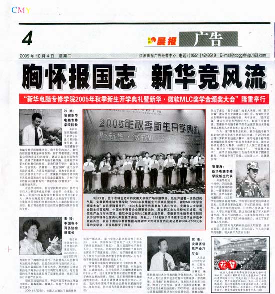 10月4日,《江淮晨報》報道“胸懷報國志 新華競風流——‘新華電腦專修學院2005年秋季新生開學典禮暨新華-微軟MLC獎學金第七期頒獎大會’在安徽大劇院隆重舉行”的新聞,并做了詳細報道,敬請關(guān)注!