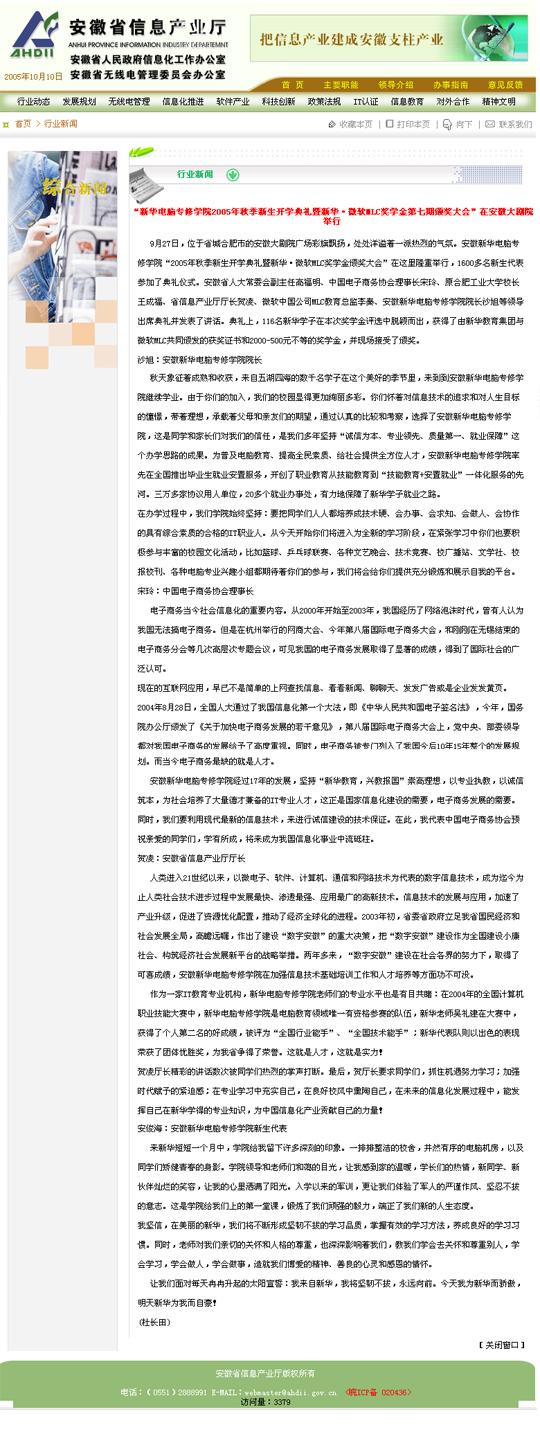 10月8日,省信息產業廳網報道“‘新華電腦專修學院2005年秋季新生開學典禮暨新華-微軟MLC獎學金第七期頒獎大會’在安徽大劇院隆重舉行”的新聞,并做了詳細報道,敬請關注!