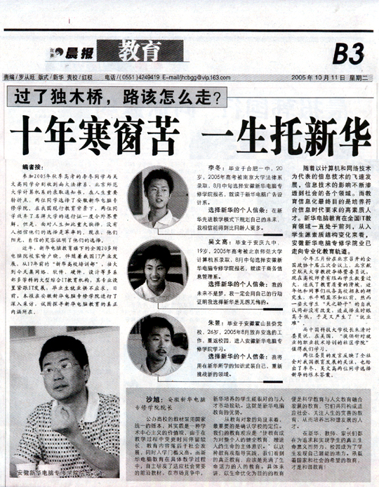 10月11日,《江淮晨報》報道“過了獨木橋,路該怎么走?——十年寒窗苦,一生托新華”的新聞,并做了詳細報道,敬請關注!