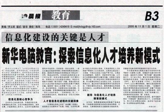11月2日,《江淮晨報》報道新華電腦教育探索信息化人才培養新模式的新聞并做了詳細報道,敬請關注!