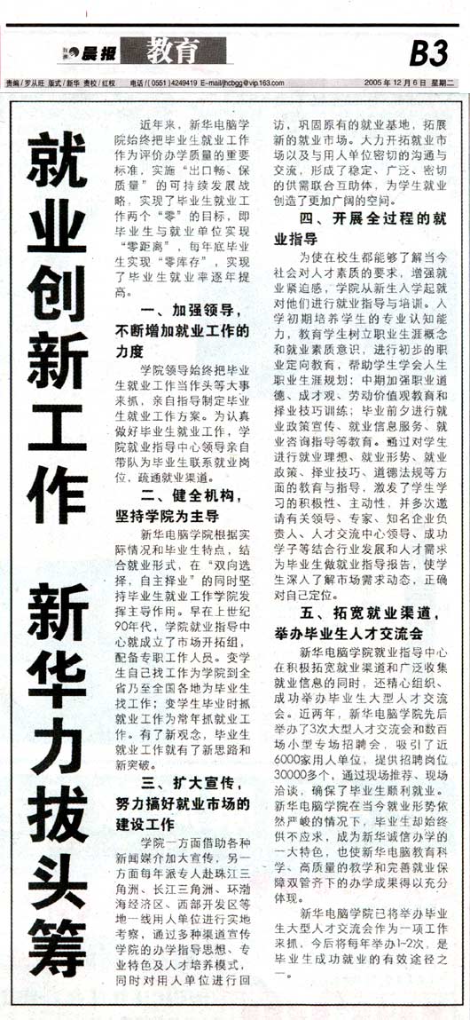 12月6日,《江淮晨報》報道“創新就業工作 新華力拔頭籌”的新聞,并做了詳細報道,敬請關注!