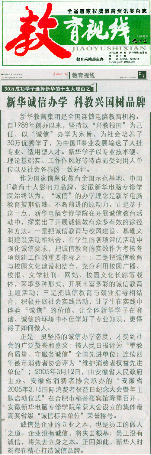正是一貫堅(jiān)持的誠(chéng)信辦學(xué)態(tài)度,才受到社會(huì)的廣泛贊譽(yù)和嘉獎(jiǎng):被人民日?qǐng)?bào)評(píng)為“重教育質(zhì)量、守服務(wù)誠(chéng)信”全國(guó)先進(jìn)單位;被省工商行政管理局、省消費(fèi)者協(xié)會(huì)評(píng)為“安徽省誠(chéng)信單位、重點(diǎn)保護(hù)單位、零投訴、名優(yōu)放心學(xué)校”;連續(xù)四年被市消費(fèi)者協(xié)會(huì)評(píng)為“維護(hù)消費(fèi)者權(quán)益先進(jìn)單位”。學(xué)院在推行誠(chéng)信教育過(guò)程中,不僅提高了在校學(xué)生的道德素質(zhì)和文化程度,而且有力地促進(jìn)了良好社會(huì)風(fēng)尚的形成。2005年3月12日,由安徽省人民政府主辦、安徽省消費(fèi)者協(xié)會(huì)承辦的“安徽省2005年3.15國(guó)際消費(fèi)者權(quán)益日紀(jì)念大會(huì)暨年主題啟動(dòng)儀式”在合肥市稻香樓賓館隆重召開(kāi),安徽新華電腦專修學(xué)院榮獲大會(huì)設(shè)立的集體最高獎(jiǎng)省級(jí)“誠(chéng)信標(biāo)兵單位”榮譽(yù)稱號(hào)。
