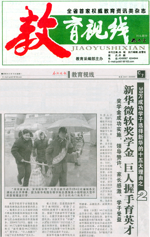 獎學金拉開序幕的隆重場景過去了,鼓舞人心的余波高潮迭起。2005年7月9日,“新華•微軟MLC1000萬元獎學金周年慶典暨尋找卓越新華人啟動儀式”上,省信息產業廳廳長賀凌在講話中把新華和微軟的此次合作譽為“巨人的握手”。截止目前,受嘉獎的新華學子逾8800名,幫助了近4000名困難學生順利完成學業,激勵了全體新華學子奮發向上,在教學實踐中發揮了重要作用。而該獎學金“卓越”大獎也于2005年12月3日進入了最后入圍評選,安徽省第二公證處對評選的整個環節和過程進行了全程記錄并予公證。