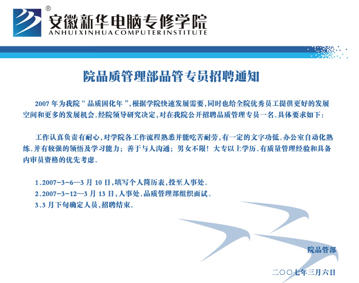 當前位置:首頁 > 新聞中心 > 通知通告 > 院品質管理部品管專員招聘通知