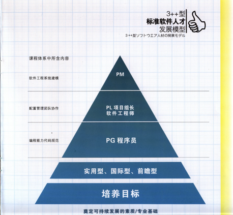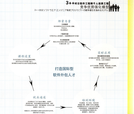 什么是3++國際型軟件人才培養(yǎng)工程 3++是一項國際型軟件工程師的人才標準。是由企業(yè)方提出需求、在職軟件專家教研模型、教育機構實施和輸出的三位一體的人才培養(yǎng)模式,是對國際型軟件工程師培養(yǎng)教育。 3++國際型軟件人才培養(yǎng)工程誕生于新華 2005年11月6日,3++國際型軟件人才培養(yǎng)工程在京正式啟動。項目針對國內國際產業(yè)環(huán)境,利用新華軟件專修學院的優(yōu)勢師資力量和領先國內的硬件教學設施,由中科院軟件教育博士、高級項目經理為首的高端軟件精英組成實戰(zhàn)教學研發(fā)團隊,目標為培養(yǎng)最符合國際軟件產業(yè)發(fā)展需要軟件項目經理高級專才、外包軟件專才,軟件安全測試專才等緊缺性人才。振興中國軟件產業(yè),促進軟件人才的培養(yǎng)和人才資源的儲備,新華電腦教育又一次掛云帆、濟滄海,為中國軟件行業(yè)的未來鍵入了一行陽光般的命令。 首批計劃——3++對日軟件工程師千人培養(yǎng)工程 對日軟件千人工程是旨在國家政策綱要的統籌下,以權威、專業(yè)的國家軟件人才教育機構為依托,以對日外包人才需求為導向,是3++國際型軟件工程師職前教育的目標下率先啟動的軟件人才培養(yǎng)工程。 中國需要3++型對日軟件標準人才