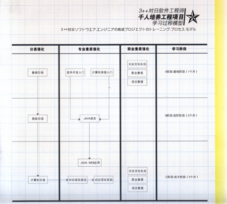 2004年9月在北京召開的第八屆中日信息服務產業(yè)懇談會上,眾多的日本企業(yè)及我國對日軟件外包企業(yè)紛紛闡述對日軟件人才的迫切渴求,一致認為日語軟件人才的稀缺已經成為軟件外包行業(yè)的瓶頸。由此,北京市政府推出雙千計劃。即每面培養(yǎng)1000名會說日語的軟件工程師,重點培育出口額在1000萬美元以上的企業(yè)。3++對日軟件千人培養(yǎng)工程正是針對我國現狀,響應國家政策、計劃性地向企業(yè)輸送對日軟件人才的標準。
