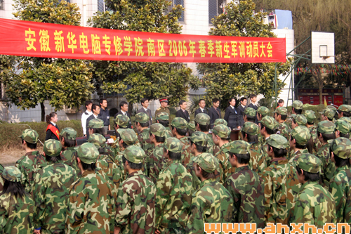 近日,安徽新華電腦專修學院南區2006年春季新生軍訓動員大會在南區籃球場隆重召開,安徽新華電腦專修學院副院長蘇凱鈞、學生處主任胡正文、教務處主任金道謝及軍訓團的有關領導出席了大會現場。