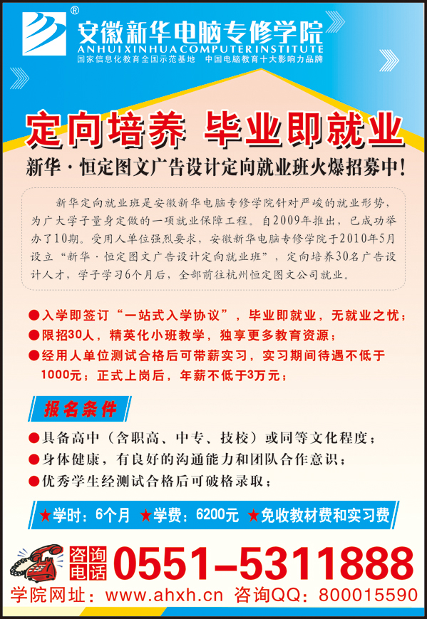 前言:新華定向就業(yè)班是安徽新華電腦專修學(xué)院針對(duì)嚴(yán)峻的就業(yè)形勢(shì),為廣大學(xué)子量身定做的一項(xiàng)就業(yè)保障工程。自2009年推出,已成功舉辦了10期。在用人單位迫切要求下,安徽新華電腦專修學(xué)院于2010年5月設(shè)立第11期“新華•恒定圖文廣告設(shè)計(jì)定向就業(yè)班”,定向培養(yǎng)30名廣告設(shè)計(jì)人才,學(xué)子學(xué)習(xí)6個(gè)月后,前往杭州恒定圖文公司就業(yè)。