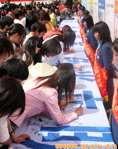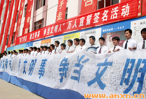 安徽新華電腦專修學院從辦學之初就積極倡導素質教育與技能教育相結合,辦學18年來一直致力于綠色校園、文明校園和IT校園的建設。值此2006文明禮貌月之際,開展“講文明話,做文明事,爭當文明人”簽名活動,旨在展現新華學子的積極風貌,倡導文明言行,弘揚中華民族的傳統美德,并為同學們創造一個健康的學習和生活環境。