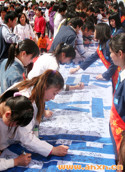 在校歌“新華的天空”的歌聲中同學們秩序井然的簽下了自己的名字