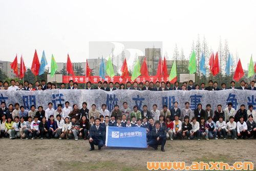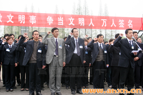 這是個春意盎然的季節,這是個萬物復蘇的季節,在這樣一個綠蔭成林的季節里,安徽新華電腦專修學院大專部的全體師生在廣闊的操場上莊嚴宣誓:我是一名新華人,為了共建我們的文明校園,我宣誓,講文明話,做文明事,遵守文明校園五要十不準,爭做文明人。每個人的臉上都掛著堅定而執著的表情,他們的聲音在合肥的高空中回蕩……