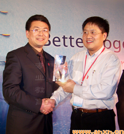 Adobe中國區總經理皮卓丁先生為安徽新華電腦專修學院院長沙旭頒發“2005年度Adobe最佳數字藝術中心”獎并表示祝賀